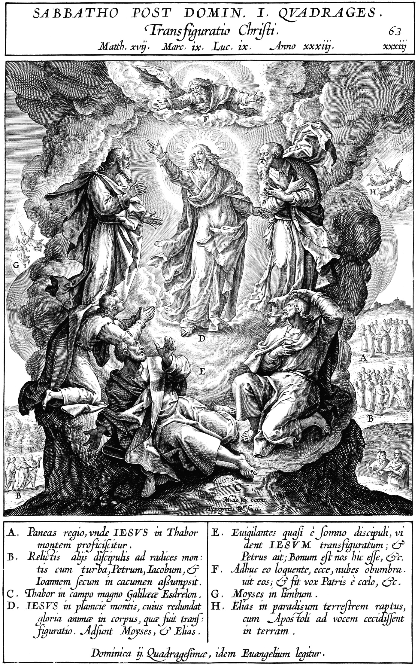 | A. Paneas regio, vnde IESVS in Thabor montem proficiscitur. B. Relictis aliis discipulis ad radices mon: tis cum turba, Petrum, Iacobum, et Ioannem secum in cacumen assumpsit. C. Thabor in campo magno Galilaeae Esdrelon. D. JESVS in plamcie montis, cuius redundat gloria animae in corpus, quae fuit transfiguratio. Adsunt Moyses, et Elias . E. Euigilantes quasi é somno discipuli, vident IESVM transfiguratum; et Petrus ait; Bonum est nos hic esse, etc. F. Adhuc eo loquente, ecce, nubes obumbra. uit eos; et fit vox Patris é coelo, etc. G. Moyses in limbum. H. Elias in paradisum terrestrem raptus, cum Apostoli ad vocem cecidissent in terram. Dominica ii. Quadragesimae, idem Euangelium legitur. |