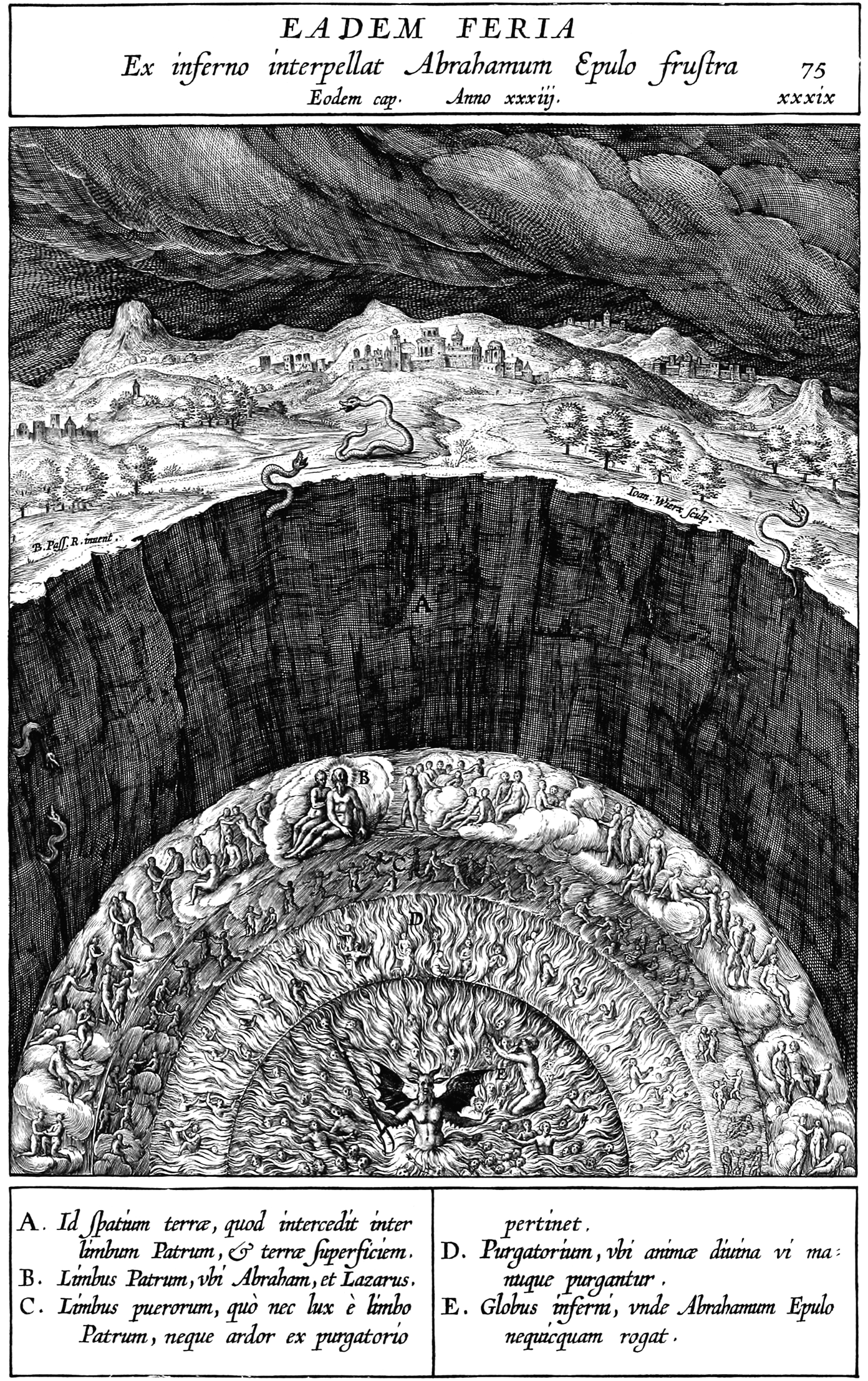 | A. Id spatium terrae, quod intercedit inter limbum Patrum, et terrae superficiem. B. Limbus Patrum, vbi Abrabam, et Lazarus. C. Limbus puerorum, quó nec lux é limbo Patrum, neque ardor ex purgatorio pertinet. D. Purgatorium, vbi animae diuina vi manuque purgantur. E. Globus inferni, vnde Abrahamum Epulo nequicquam rogat. |