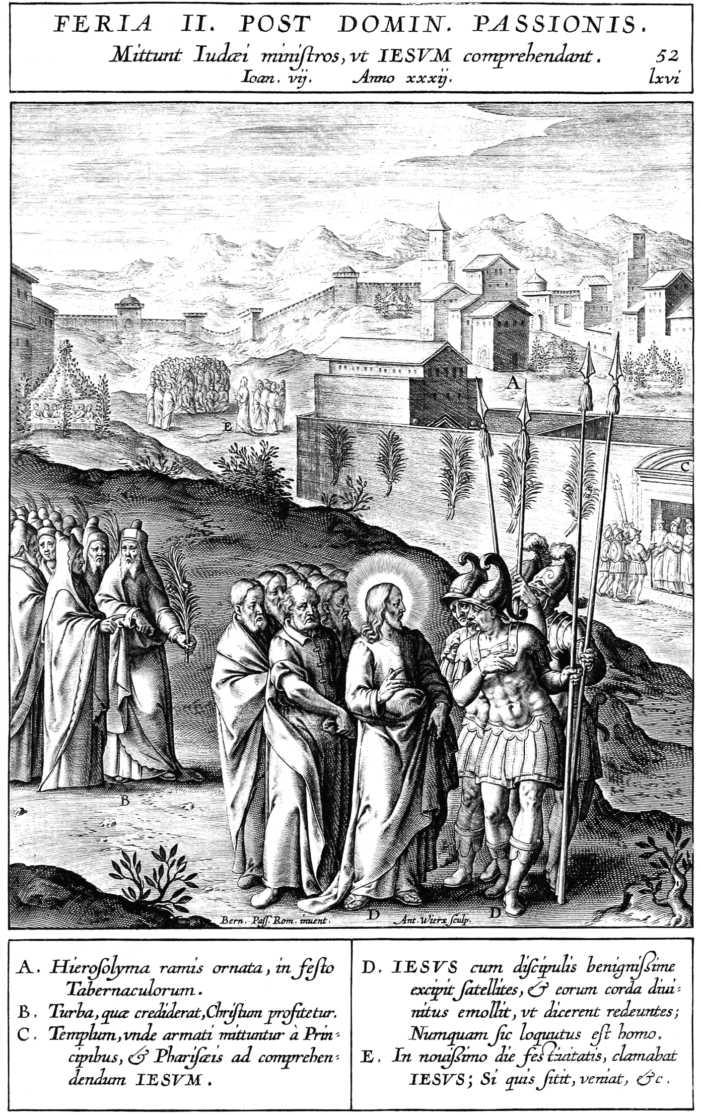 | A. Hierosolyma ramis ornata, in festo Tabernaculorum. B. Turba, quae crediderat, Christum profitetur. C. Templum, vnde armati mittuntur á Principibus, et Pharisaeis ad comprehendendum IESVM. D. IESVS cum discipulis benignissime excipit satellites, et eorum corda diuinitus emollit, vt dicerent redeuntes; Numquam sic loquutus est homo. E. In nouissimo die festiuitatis, clamabat IESVS; Si quis sitit, veniat, etc. |