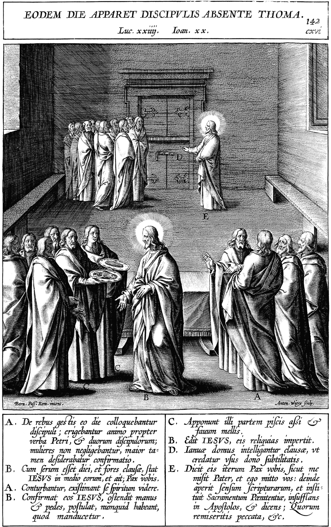 | A. De rebus gestis eo die colloquebantur discipuli; erigebantur animo propter verba Petri, et duorum discipulorum; mulieres non negligebantur, maior tamen desiderabatur confirmatio. B. Cum serum esset diei, et fores clausae, stat IESVS in medio eorum, et ait; Pax vobis. A. Conturbantur, existimant se spiritum videre. B. Confirmat eos IESVS, ostendit manus et pedes, postulat, numquid baheant, quod manducetur. C. Apponunt illi partem piscis assi et fauum mellis. B. Edit IESVS, eis reliquias impertit. D. Ianuae domus intelligantur clausae, vt credatur vsus dono subtilitatis. E. Dicit eis iterum Pax vobis, sicut me misit Pater, et ego mitto vos: deinde aperit sensum scripturarum, et instituit Sacramentum Poenitentiaa, insufflans in Apostolos, et dicens; Quorum remiseritis peccata, etc. |