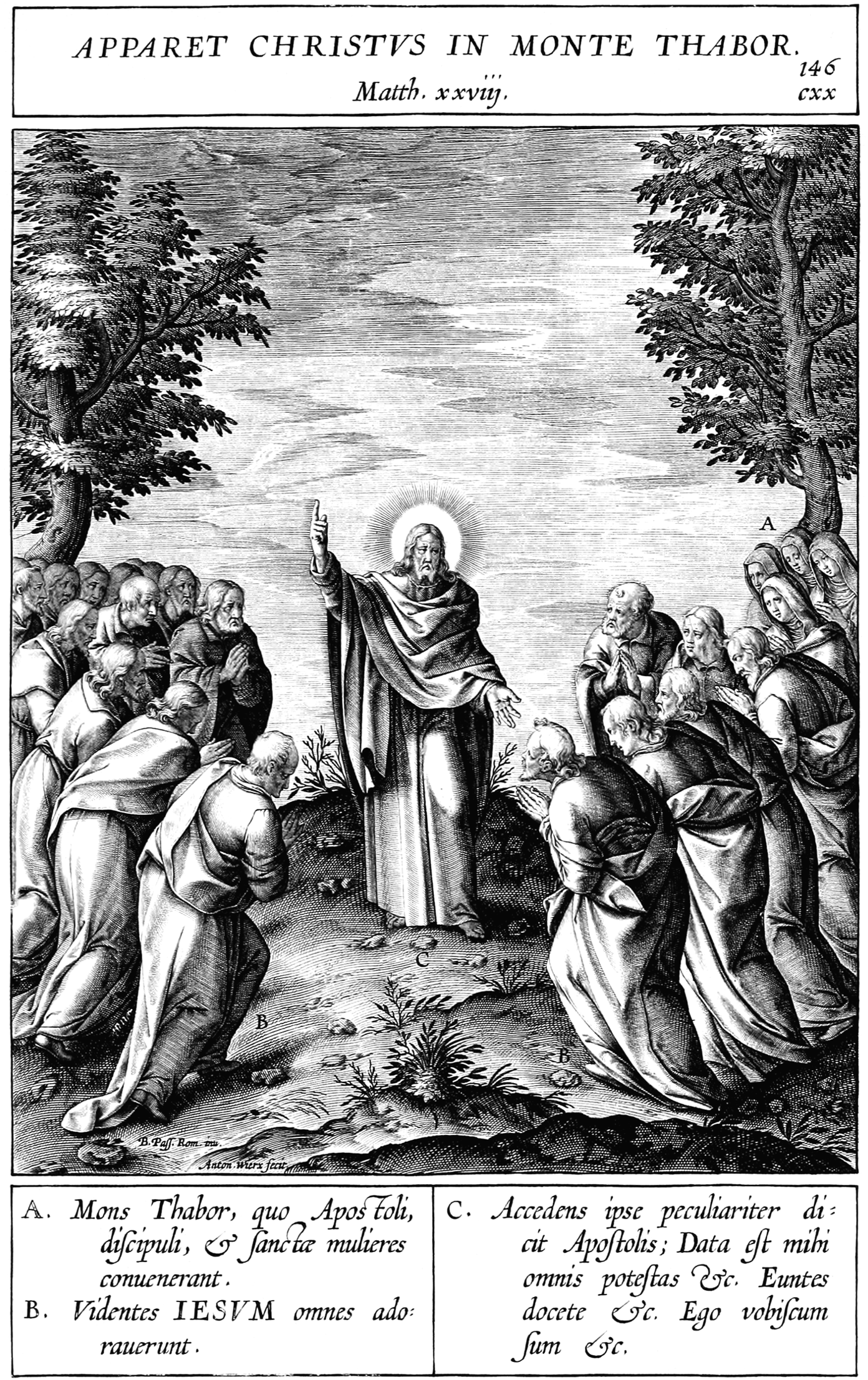 | A. Mons Thabor, quo Apostoli, discipuli, et sanctae mulieres conuenerant. B. Videntes IESVM omnes adorauerunt. C. Accedens ipse peculiariter dicit Apostolis; Data est mihi omnis potestas etc. Euntes docete etc. Ego vobiscum sum etc. |