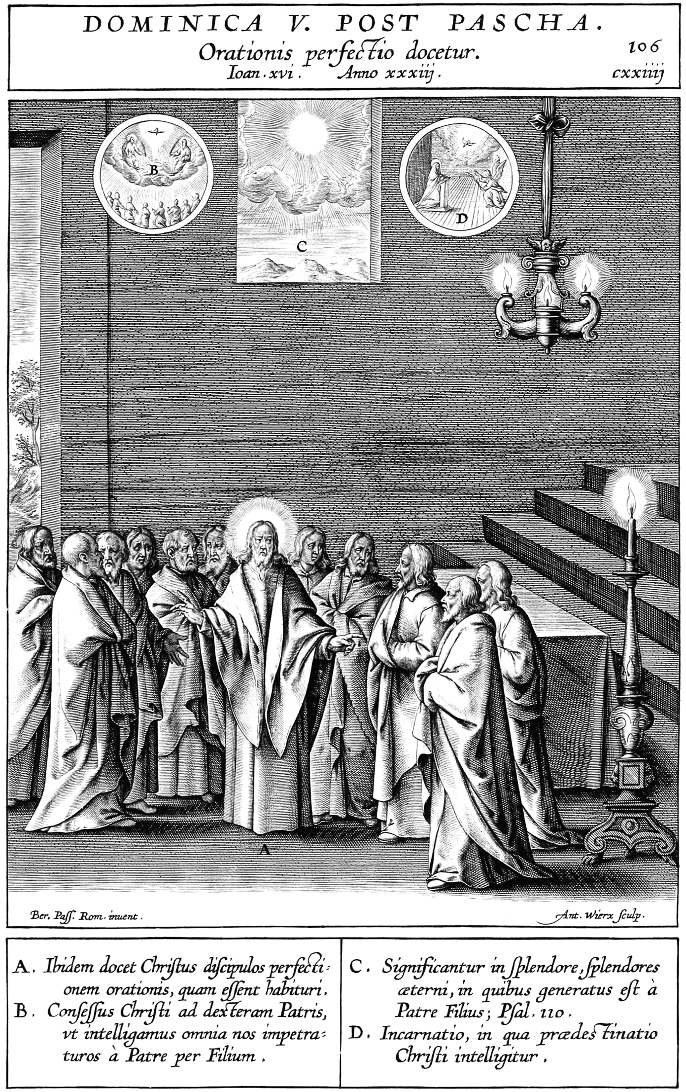 | A. Ibidem locet Christus discipulos perfectionem orationis, quam essent habituri. B. Consessus Christi ad dexteram Patris, vt inteligamus omnia nos impetraturos á Patre per Fílium. C. Significantur in splendore, splendores aeterni, in quibus generatus est á Patre Fílius; Psal. 110. D. Incarnatio, in qua praedestinatio Christi intelligitur. |