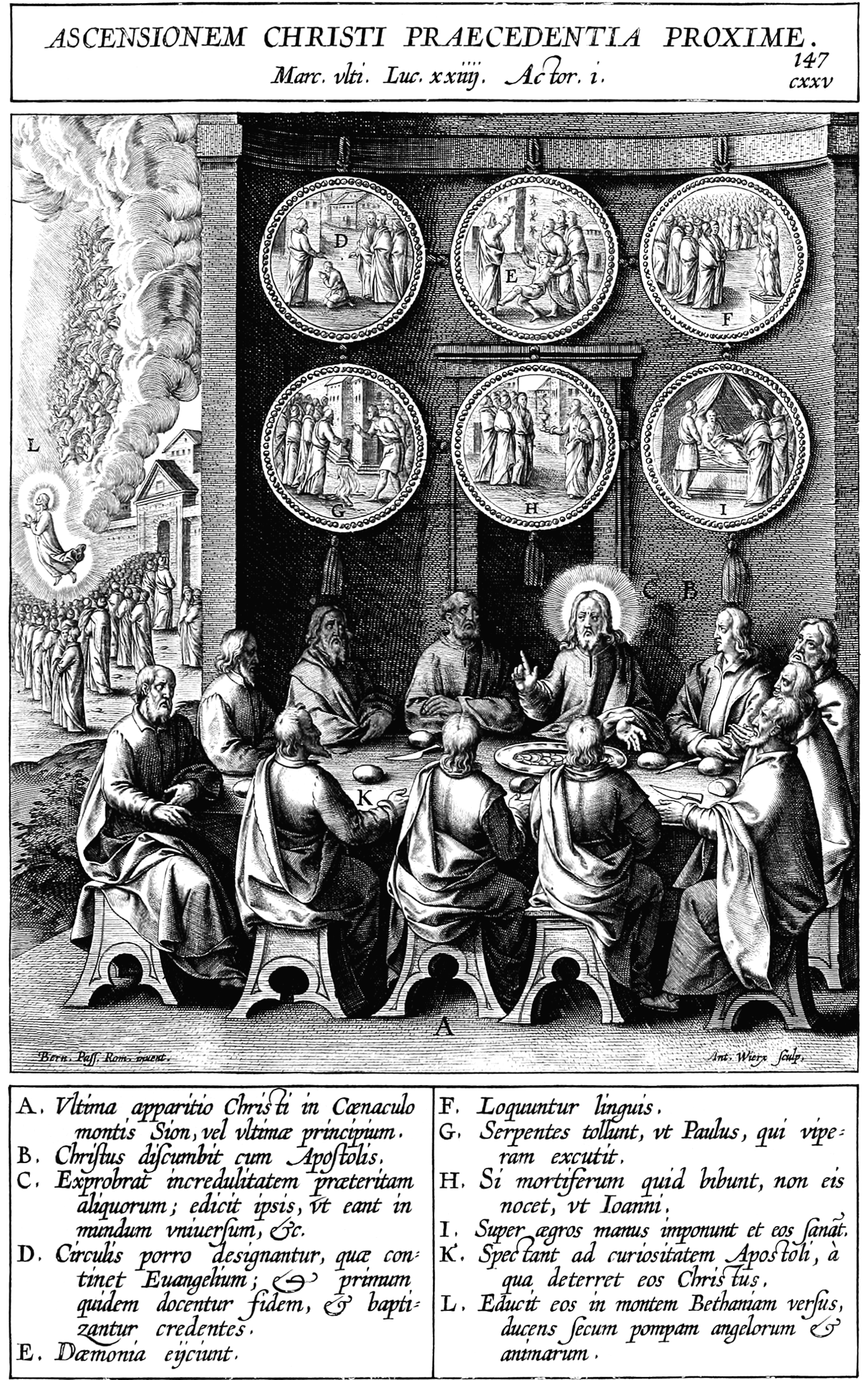 B. Kristus stoluje s apoštolmi. C. Vyčíta minulú neveru niektorých; Hovorí im, aby išli do celého sveta atď. D. Ďalej sú v kruhoch zobrazené výjavy z evanjelia: najprv učia vieru a veriaci sú pokrstení. E. Vyháňajú démonov. F. Hovoria jazykmi. G. Berú hady ako Pavol, ktorý vyháňa zmiju. H. Ak vypijú čokoľvek smrtonostné, neuškodí im to, ako sa prihodilo Jánovi. I. Vkladajú ruky na chorých a uzdravujú ich. K. Apoštoli sú zvedaví, od čoho ich Kristus odrádza. L. Vedie ich na horu smerom k Betánii a spolu s ním ide sprievod anjelov a duší. |