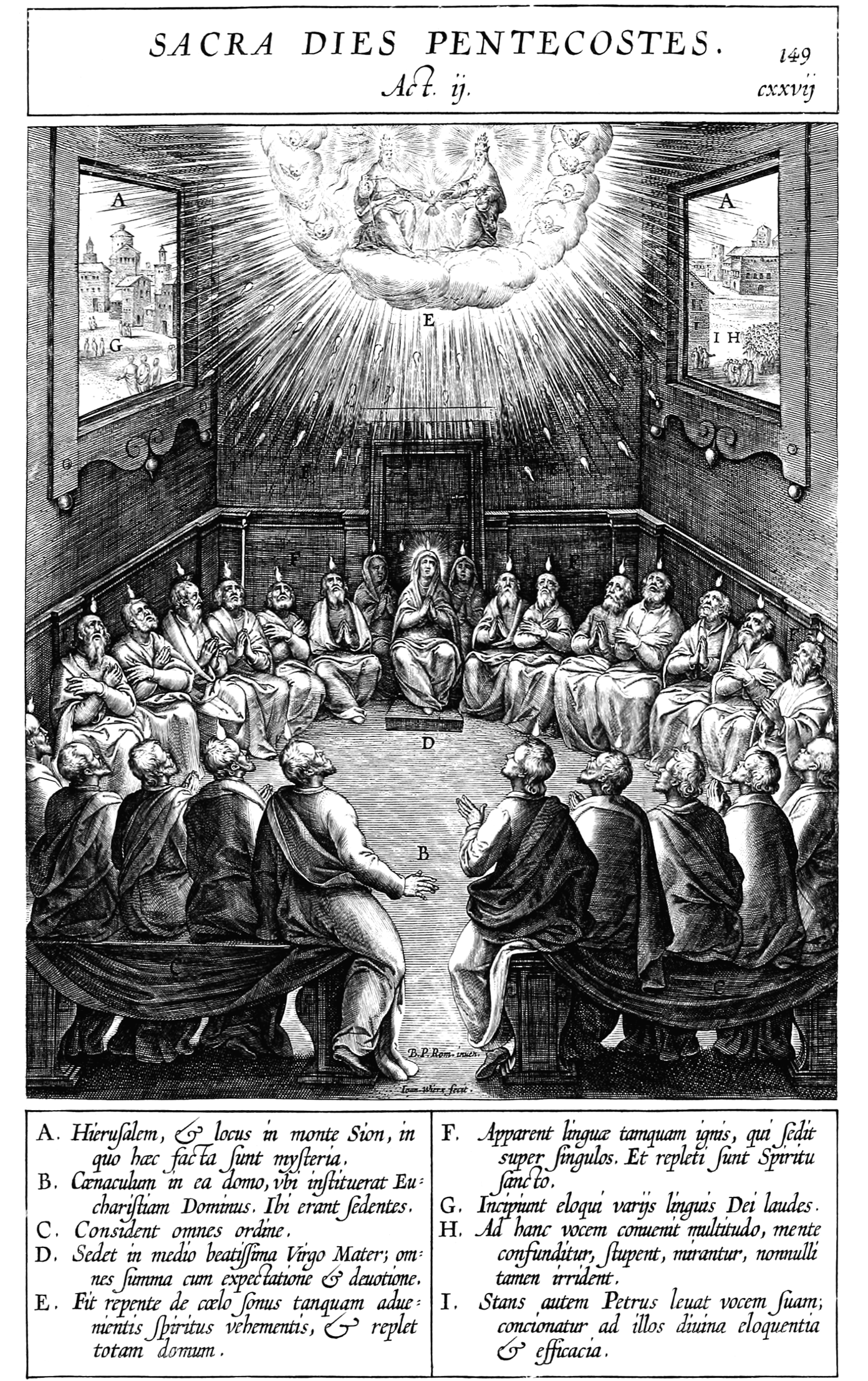| A. Hierusalem, & locus in monte Sion, in quo haec facta sunt mysteria. B. Caenaculum in ea domo, vbi instituerat Eucharistiam Dominus. Ibi erant sedentes. C. Consident omnes ordine. D. Sedet in medio beatissima Virgo Mater; omnes summa cum expectatione et deuotione. E. Fit repente de caelo sonus tanquam aduenientis Spiritus vehementis, et replet totam domum. F. Apparent linguae tamquam ignis, qui sedit super singulos. Et repleti sunt Spiritu sancto. G. Incipiunt eloqui variis linguis Dei laudes. H. Ad hanc vocem conuenit multitudo, mente confunditur, stupent, mirantur, nonnulli tamen irrident. I. Stans autem Petrus leuat vocem suam; concionatur ad illos diuina eloquentia et efficacia. |