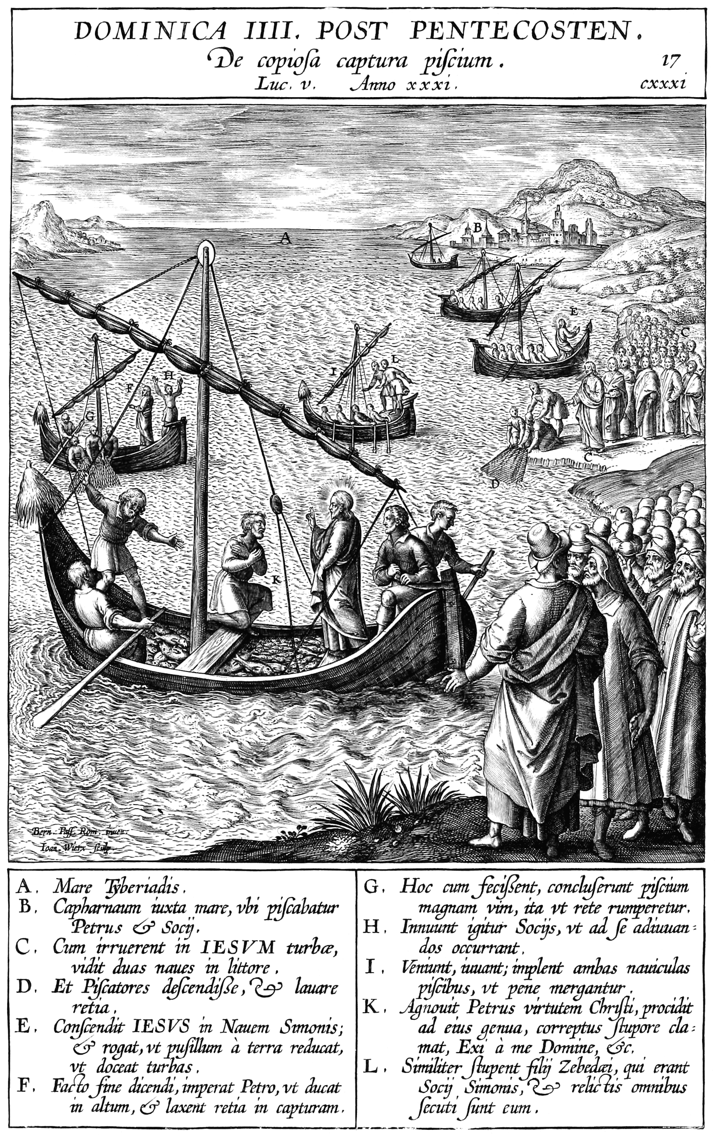 | A. Mare Tyberiadis. B. Capharnaum iuxta mare, vbi piscabatur Petrus et Socii. C. Cum irruerent in IESVM turbae, vidit duas naues in littore, D. Et Piscatores descendisse, et lauare retia. E. Conscendit IESVS in Nauem Simonis; et rogat, vt pusillum á terra reducat, vt doceat turbas. F. Facto fine dicendi, imperat Petro, vt ducat in altum, et laxent retia in capturam. G. Hoc cum fecissent, concluserunt piscium magnam vim, ita vt rete rumperetur. H. Innuunt igitur Sociis, vt ad se adiuuandos occurrant. I. Veniunt, iuuant; implent ambas nauiculas piscibus, vt pene mergantur. K. Agnouit Petrus virtutem Christi, procidit ad eius genua, correptus stupore clamat, Exi á me Domine, etc. L. Similiter stupent filii Zebedaei, qui erant Socii Simonis, et relictis omnibus secuti sunt eum. |