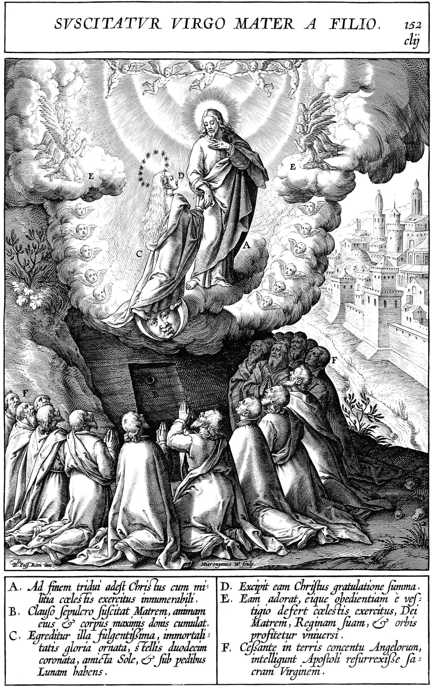 | A. Ad finem tridui adest Christus cum militia caelestis exercitus innumerabili. B. Clauso sepulcro suscitat Matrem, animam eius et corpus maximis donis cumulat C. Egreditur illa fulgentissima, immortalitatis gloria ornata, stellis duodecim coronata, amicta Sole, et sub pedibus Lunam habens. D. Excipit eam Christus gratulatione summa. E. Eant adorat, eique obedientiam é vestigio desert coelestis exercítus, Dei Matrem, Reginam suam, et orbis profitetur vniuersi. F. Cessante, in terris concentu Angelorum, intelligunt Apostoli resurrexisse sacram Virginem. |