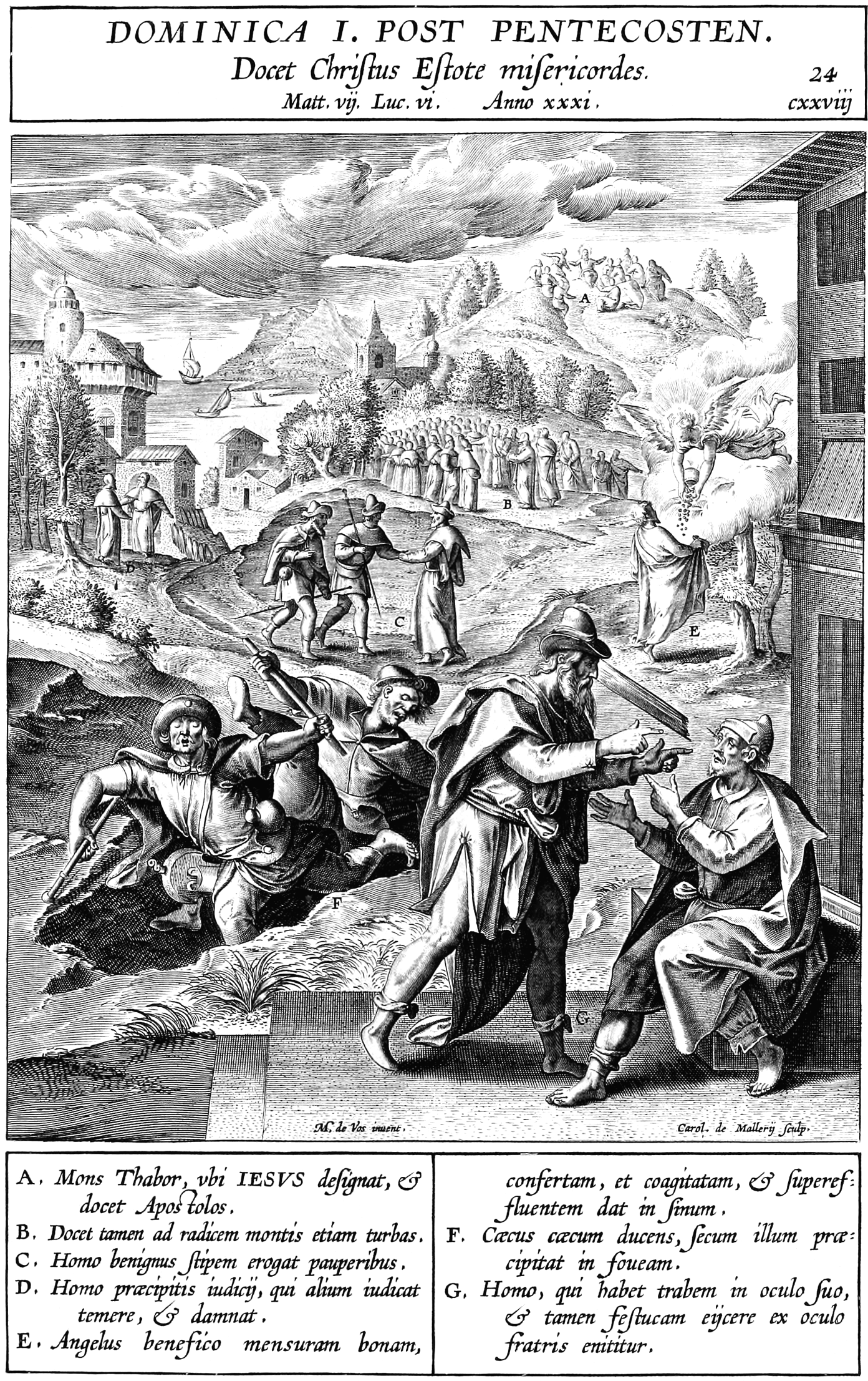 | A. Mons Thabor, vbi IESVS designat, et docet Apostolos. B. Docet tamen ad radicem montis etiam turbas. C. Homo benignus stipem erogat pauperibus. D. Homo praecipitis iudicii, qui alium iudicat temere, et damnat. E. Angelus benefico mensuram bonam, confertam, et coagitatam, et supereffluentem dat in sinum. F. Caecus caecum ducens, secum illum praecipitat foueam. G. Homo, qui habet trabem in oculo suo, et tamen festucam eiicere ex oculo fratris enititur. |